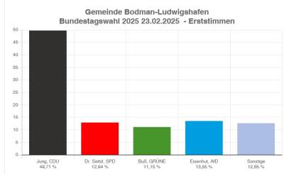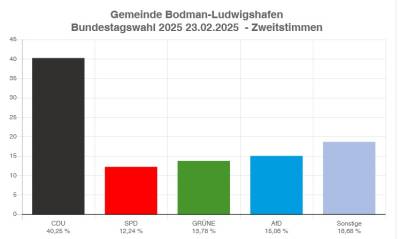 Die CDU gewinnt in Bodman-Ludwigshafen bei Erst- und Zweitstimmen deutlich hinzu. Andreas Jung (CDU) erreichte fast 50 Prozent der Erststimmen (ein Plus von mehr als 8 Prozent) und die CDU knapp über 40 Prozent (ein Plus von mehr als 11 Prozent) der abgegebenen Zweitstimmen gegenüber der Bundestagswahl 2021.