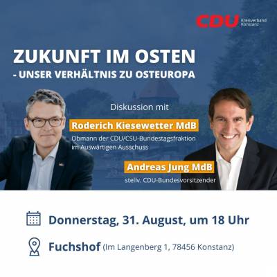Wir freuen uns sehr, Sie zu einem ganz besonderen Termin einladen zu können. Roderich Kiesewetter MdB wird bei uns zu Gast sein. Roderich Kiesewetter hat sich als Obmann der CDU-Fraktion im Auswärtigen Ausschuss und Oberst a.D. der Bundeswehr bundesweit einen Namen als Fachmann für außen- und sicherheitspolitische Themen erarbeitet. Gemeinsam mit unserem Bundestagsabgeordneten und stellvertretenden Bundesvorsitzenden Andreas Jung wollen wir mit Herrn Kieswetter unter dem Titel „Zukunft im Osten – unser Verhältnis zu Osteuropa“ fragen, wie sich dieses Verhältnis grundsätzlich, insbesondere aber in außen-, sicherheits- und energiepolitischer Hinsicht gestalten soll.